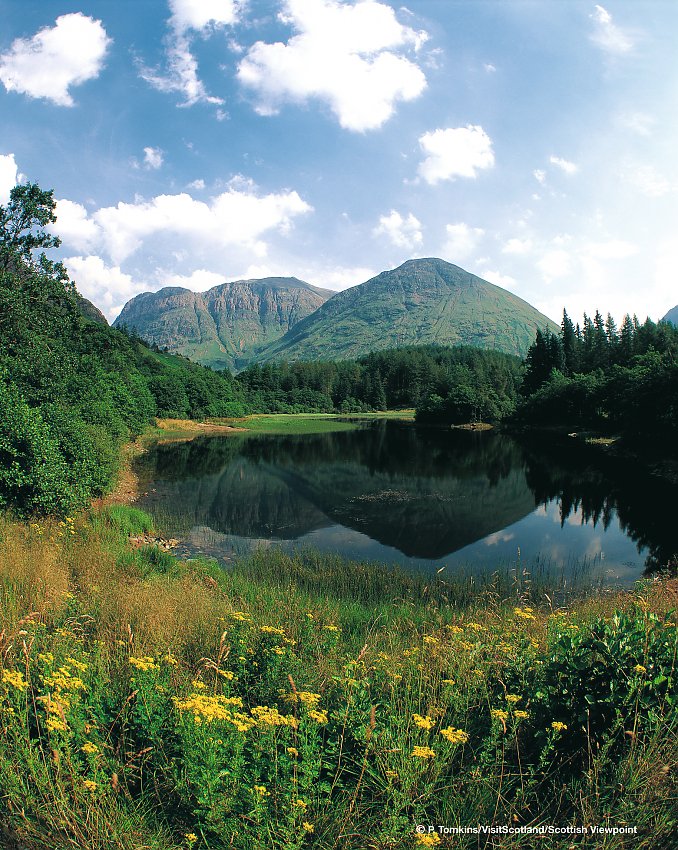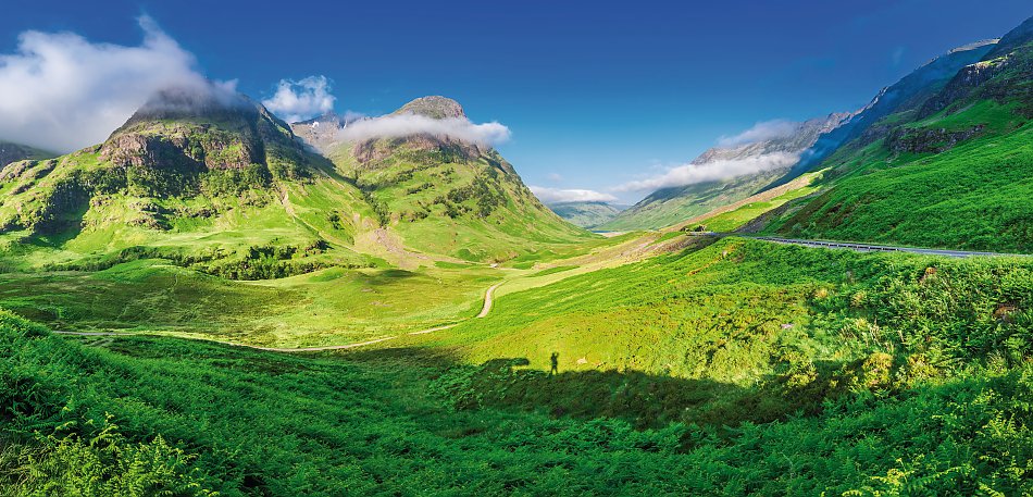 Glen Etive ist ein tief eingeschnittenes Tal, das sich vom oberen Glen Coe bis hinunter zum Loch Etive erstreckt. Die Landschaft wirkt monumental: schmale, grüne Hänge, weit geschwungene Grasflächen und steile Bergflanken umgeben den glasklaren River Etive, der in sanften Kurven durch den Talboden fließt und schließlich als breiter, eleganter See in das Meer mündet. Die Straße durch das Glen ist ein schmaler, kurvenreicher Single Track Road, der sich behutsam an die Landschaft schmiegt und vor allem Ruhe und Abgeschiedenheit vermittelt. Sie endet am Ufer des Loch Etive, wo der Blick frei wird über Wasser, Licht und Berge – eine Kulisse, die seit Jahren Künstler, Fotografen und Wanderer gleichermaßen inspiriert. Die Berge, die das Tal flankieren, gehören zu den markantesten in den Highlands: Buachaille Etive Mòr und Buachaille Etive Beag, die „Hirten von Etive“, dominieren den nördlichen Teil mit ihren pyramidalen Formen und steilen Graten, während weitere gipflige Riesen wie Ben Starav die Skyline prägen. Überall im Glen scheint die Natur ungezähmt: das klar fließende Wasser des Etive, weite Grasflächen voller Wildblumen im Sommer, rotbraune Heide im Herbst und der weite Himmel darüber. Wildtiere wie rotbraune Hirsche, goldene Adler und andere scheue Bewohner der Highlands teilen sich diese Landschaft – Glen Etive gilt als eines der malerischsten Täler Schottlands.